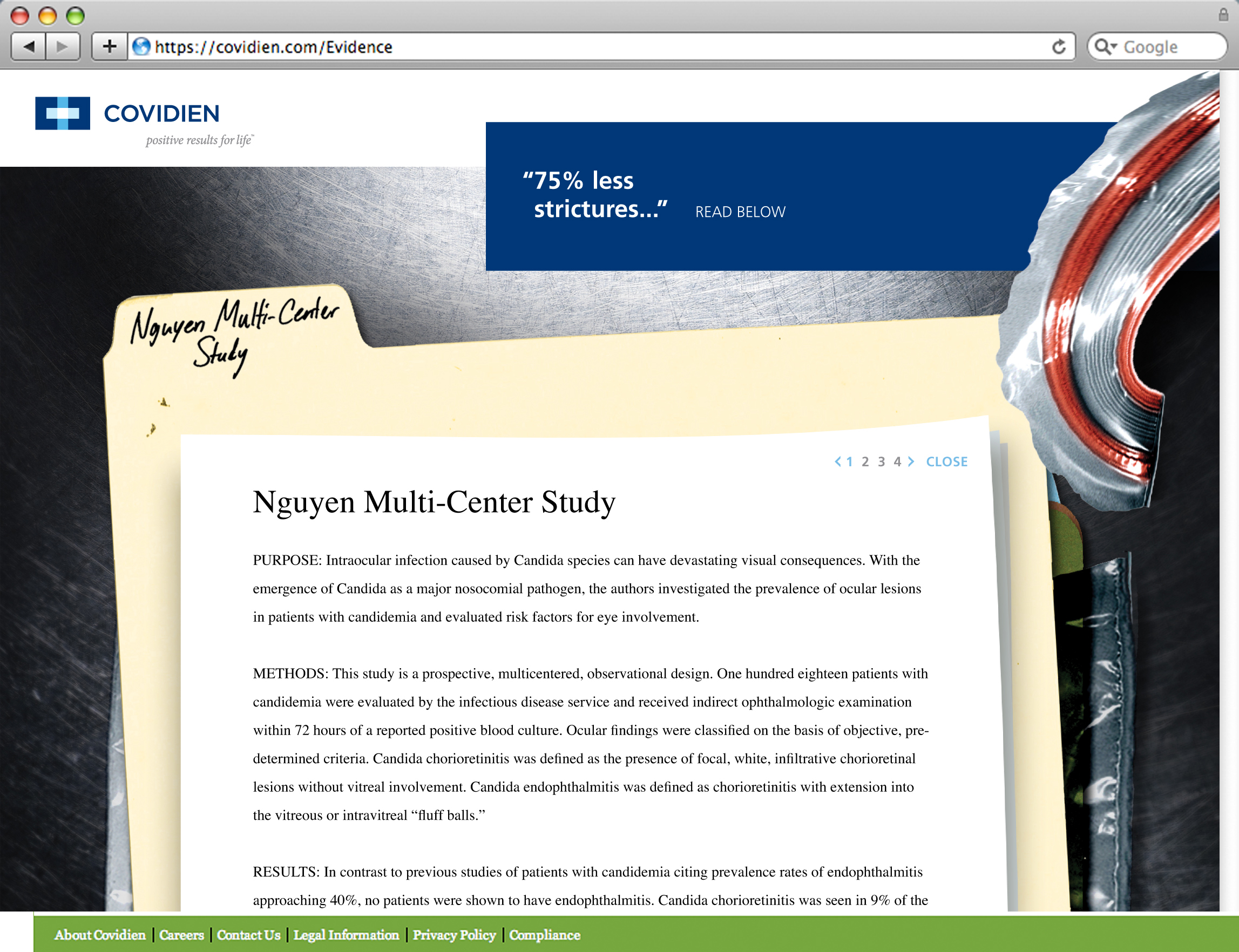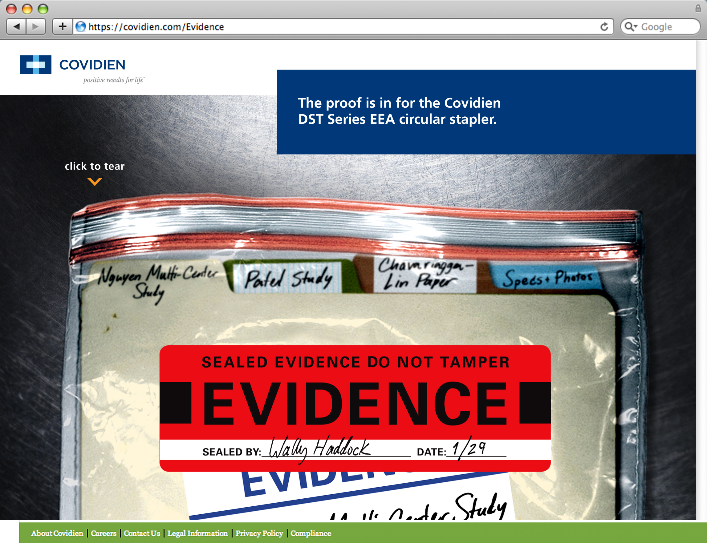 Covidien DST EEA Evidence website home page. The user is prompted to click to tear open the sealed documents to read compelling data.