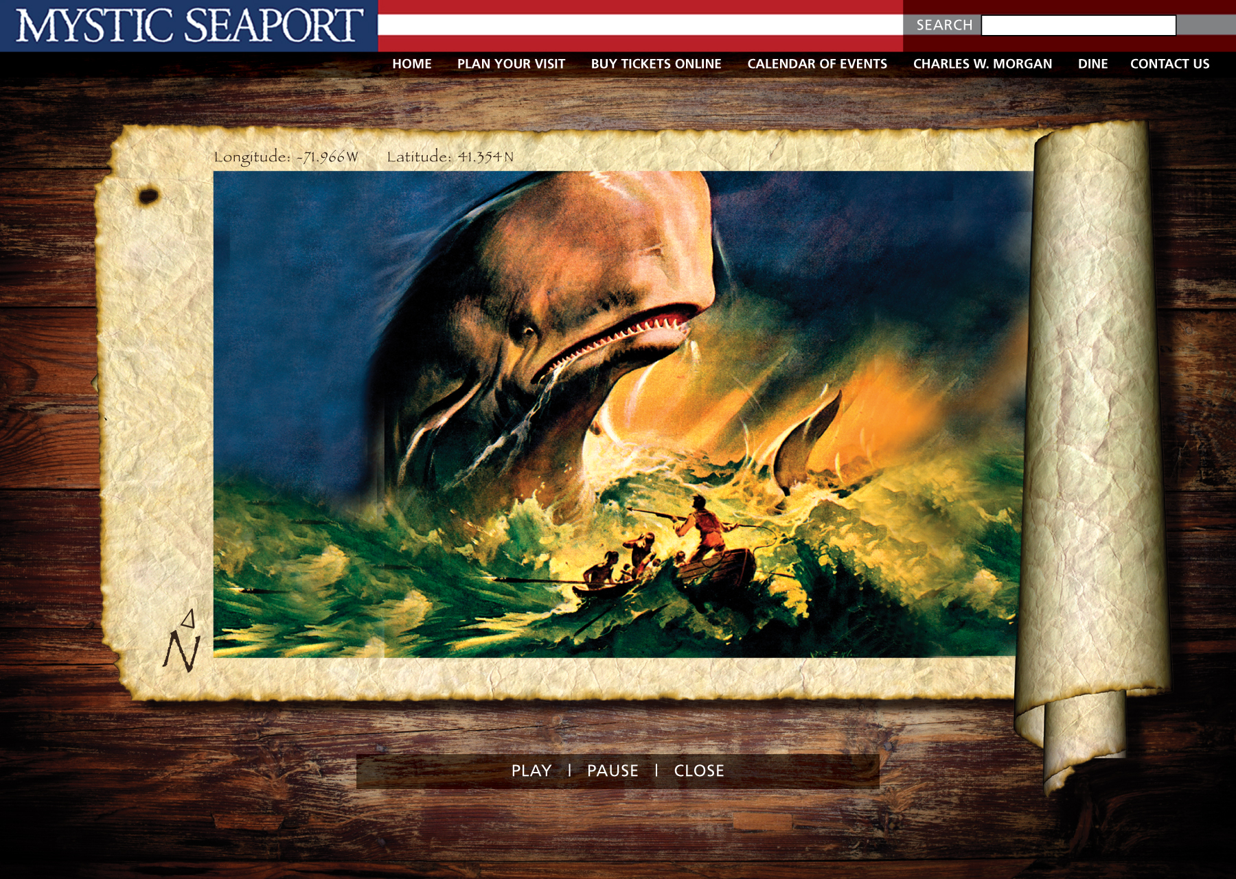 Proposed redesign for Mystic Seaport website. The homepage has a weathered scroll unroll & reveal an intro video.